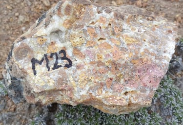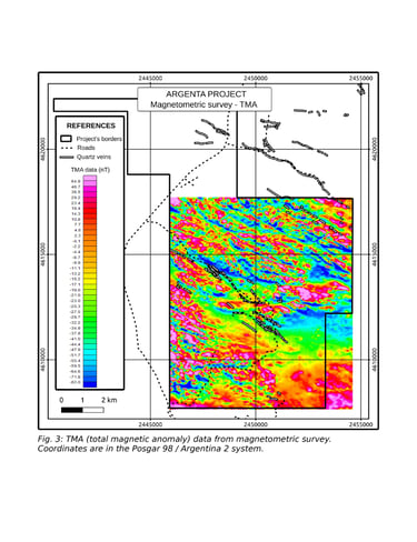 In 2023, Fomicruz carried out additional exploration in the project, collecting abundant data, part of which are still being interpreted. That work included (a) general lithological mapping (Fig. 2); (b) recognizance of areas that had not been previously visited, discovering a few new veins; (c) detailed mapping of several veins; (d) ground-based magnetometric surveys, covering 8800 ha (Fig. 3); (e) collection of more geochemical rock samples from the veins, which add to the 494 total outcrop samples in the project; (f) collection of samples for being analyzed by a portable x-ray spectrometer and a reflectance spectrometer; (g) a gammaray survey with a handheld spectrometer that allows discrimination of K, Th and U.