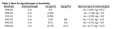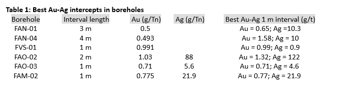 The drilling demonstrated that the veins are continuous up to a vertical depth of at least 201 m, and that their thickness are similar to those at ground surface. At the same time, topography and surface geology were surveyed in the sectors where the drilling was done. Assays from several boreholes returned