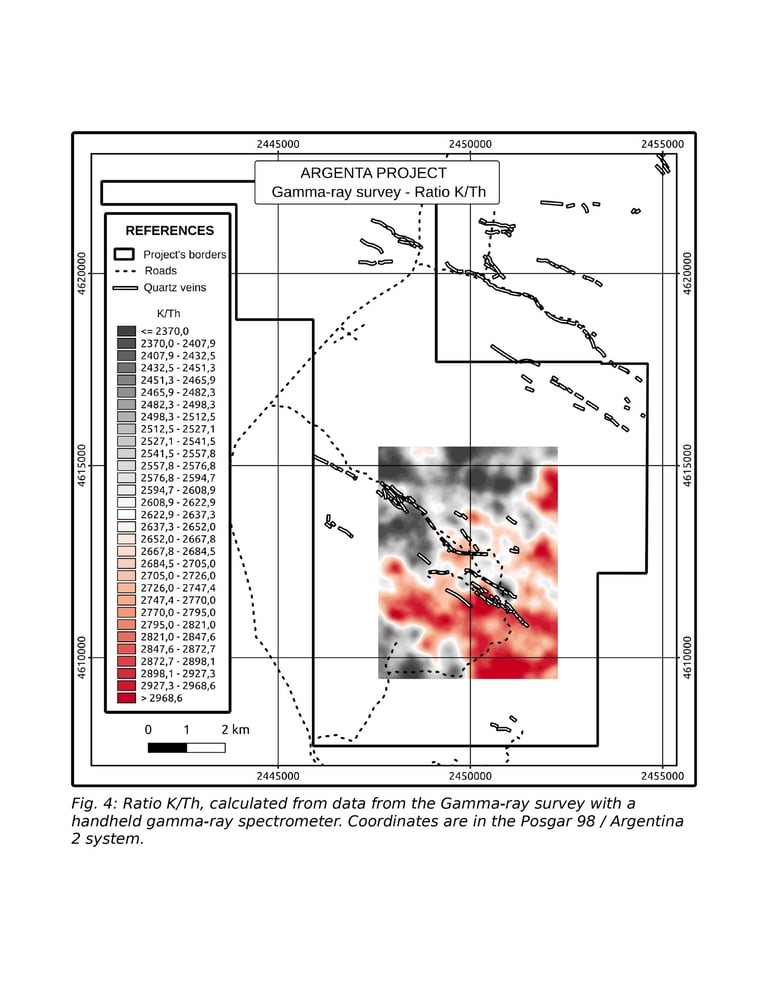 Almost 3000 ha were surveyed with our gamma-ray spectrometer, mapping the contents of potassium and thorium, to test their ability to detect potassic alteration and the presence of adularia. In general, that survey (Fig. 4) showed spatial correlation of high potassium contents with the location of several veins, particularly with those where adularia was observed. From now on, the company has to fully evaluate all the data collected in the project to be able to determine the next steps to follow, which may include further drilling.