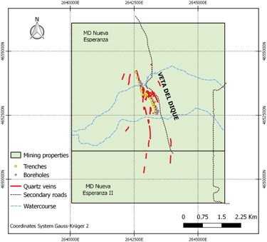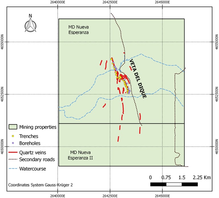 The most prospective sector in the Project is called Vetas del Dique, which is a NNW-trending strip that includes a main vein, called Veta del Dique, and a sub-parallel secondary vein. Towards the south of this sector, there are other veins of similar width located along the same trend of veins. In addition, minor veins are scattered over a large part of the project area.