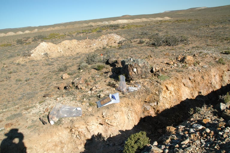 Massif, at 100 km to the southwest of Puerto Deseado city and at about 35 km WSW of the Cerro Moro Au-Ag mine. The area of the project is secured by two mining properties (discovery manifestations / MD), covering a total area of 5000 ha. The mineralization of Au and Ag in this project occurs in narrow veins (thickness < 1m) of quartz with massive, comb, crustiform-colloform, and bladed textures, as well as some breccias. The veins contain pyrite, chalcopyrite and scarce galena, and are hosted mainly in the La Golondrina (Permian) and Chon Aike (Jurassic) Formations.