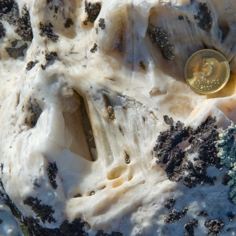 Chemical assays of rock chips from the Silvia vein returned anomalous gold concentrations (of up to 382 ppb) and strongly anomalous Hg concentrations (up to 3000 ppb). Rock chips from the Alejandra vein also returned anomalous Au and Hg concentrations, although lower than those from the Silvia vein.