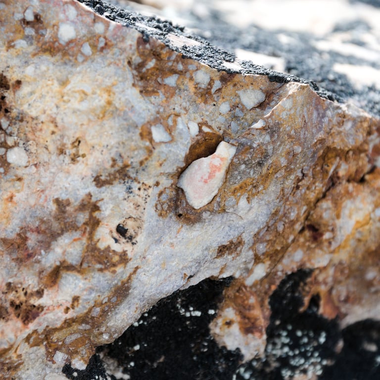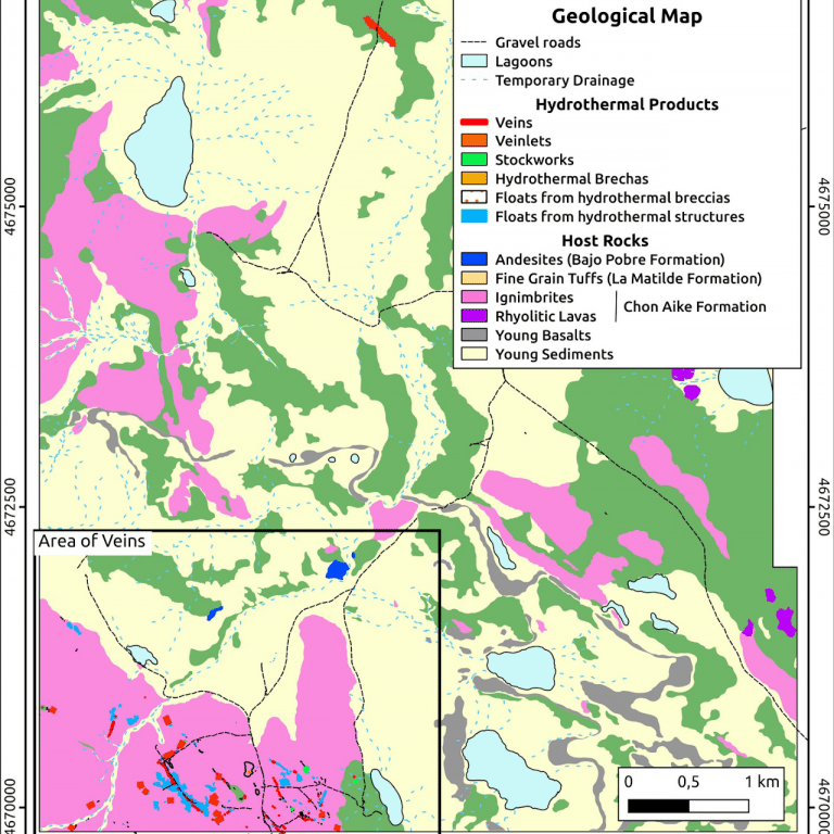 This project includes several siliceous veins that are concentrated in its southwestern portion, and that add up a total of around 3500 linear meters, in a partially discontinuous way. In addition, there are several stockworks and rock outcrops crossed by disseminated veinlets. Most of the veins follow a northwest orientation, although a few are oriented to the northeast; they have widths that locally exceed two meters; and they show a variety of quartz textures, including: massive, saccharoidal, replacement, and comb; and some of them also include considerable amounts of breccias with fragments from previous veins, and abundant iron oxides in their cement.