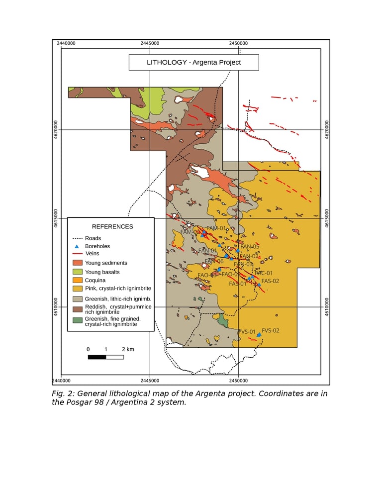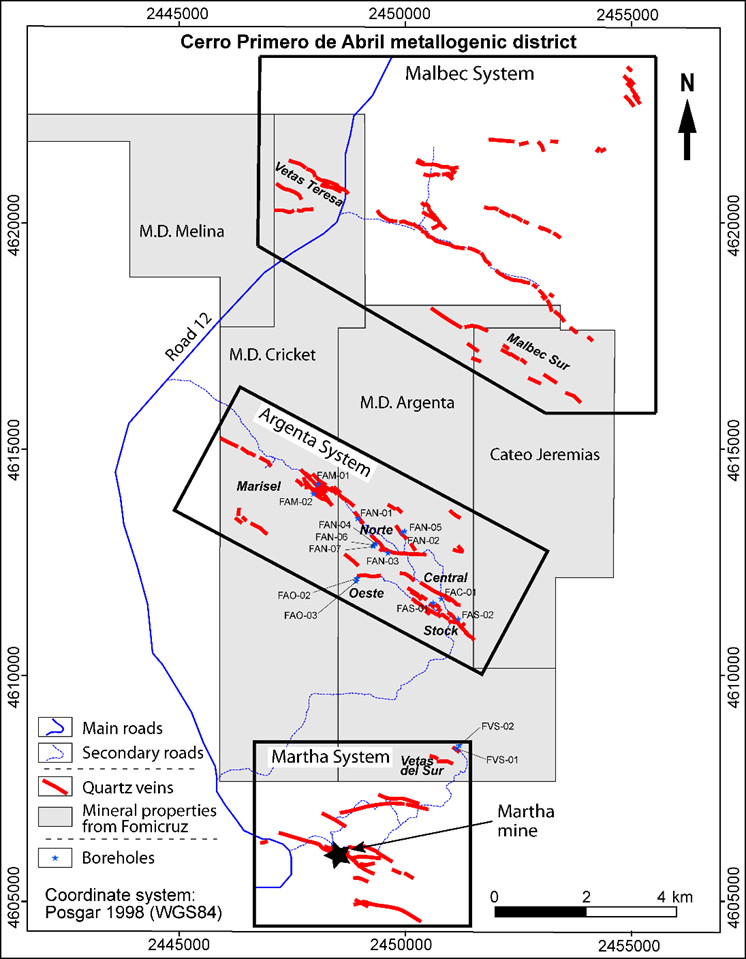 The Argenta project is located in the southwest of the Deseado Massif, adjacent to the Martha silver mine, and in the Cerro Primero de Abril metallogenic district. The project contains several sets of epithermal quartz veins, with a summed total length of 11 km. Some of the veins also contain adularia.
