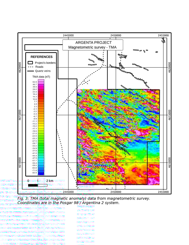 In 2023, Fomicruz carried out additional exploration work in the project, collecting abundant data that is being interpreted. That work included detailed mapping of several veins; recognizance of some areas that had not been previously visited; a ground-based magnetometric survey covering the whole project; the collection of rock samples for geochemical analyses (more than 500 samples in total), as well as samples for being analyzed by a portable x-ray spectrometer and a reflectance spectrometer.