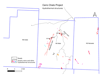 The Cerro Chato project is secured by four mining properties, covering a total area of 11000 ha, which are adjacent to the La Juanita project and only a few kilometers away from the Don Nicolas Au-Ag mine. The most relevant hydrothermal features in the project are two quartz veins, of considerable extension and width, named Silvia and Alejandra, as well as other minor veins in the center and east of the project.
