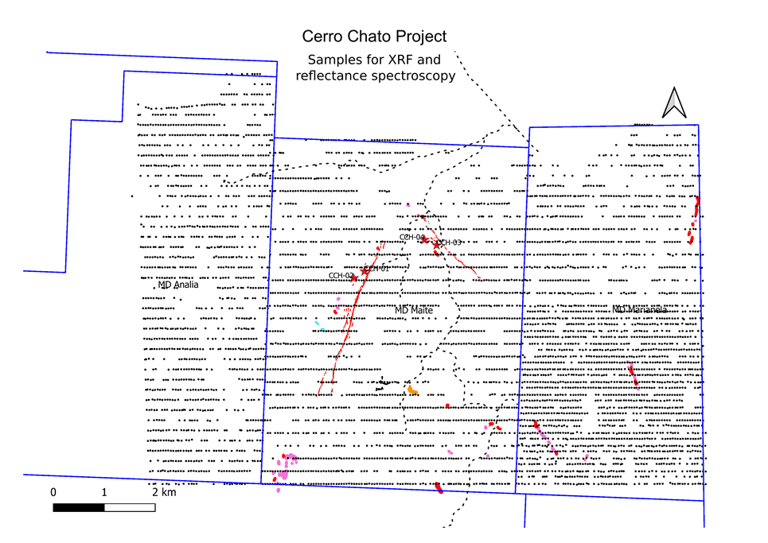 In 2019, extra field work was carried out in the project to collect surface data and try to get a better inside of the epithermal paleo-system. In that occasion, the lithology of the most relevant portion of the project was mapped with detail, showing the presence of a few veins that had been previously been unnoticed. More than 30 rock samples were collected from those veins; some of which returned anomalous concentrations of Au, As, Cu, Pb, and Zn. In addition, magnetometric data were registered along 265 linear kilometers, and more than 5000 small samples were collected for being analyzed by portable XRF and reflectance spectroscopy, tasks that still should be completed.