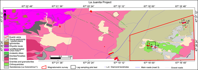 The project is dominated by markedly different lithologies. In the western sector (west of road 3), Jurassic igneous rocks dominate; those include granitoids from the La Leona Formation and volcanic rocks from the Chon Aike Formation (ignimbrites and rhyolitic domes), as well as several volcanic dikes of andesitic composition. In the eastern sector, sandstones of the La Golondrina and La Juanita Formations (Permic), and a few granitoids (Jurassic) are the dominant rocks. In addition, large part of the eastern sector, is covered by relatively thin gravel plains.