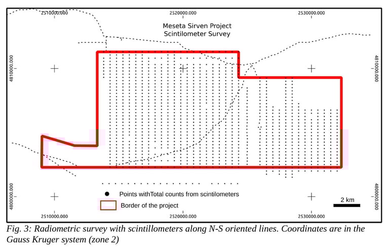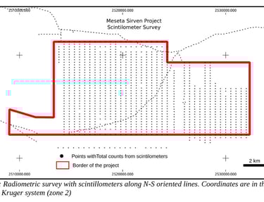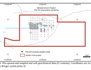 In this project, a layer of young sediments located at shallow depths (commonly at around 1 m depth), is mineralized with uranium (Fig. 2a). That layer of sands and gravels with some carbonates (caliche) and gypsum, forms a low-grade uranium deposit. The project was explored at surface by radimetric surveys, and at depth by geochemical sampling of the sediments, collected from pits opened with a backhoe (Fig. 2b).