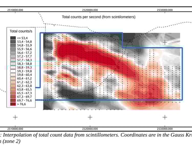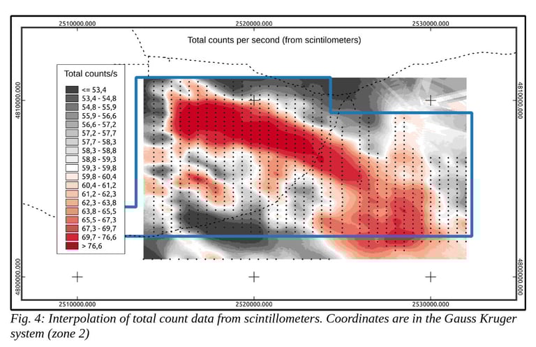 A systematic radiometric ground-based survey was carried out with scintillometers; more than 1000 readings of total counts per second, provided by the scintillometers, were recorded (Fig. 3). Those data were collected at points separated about 250 m from each other, along north-south oriented lines, which were separated by 500 m from each other. The result of this survey was the definition of a northwest-southeast trending anomaly (Fig. 4) that was later studied in subsurface.