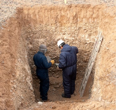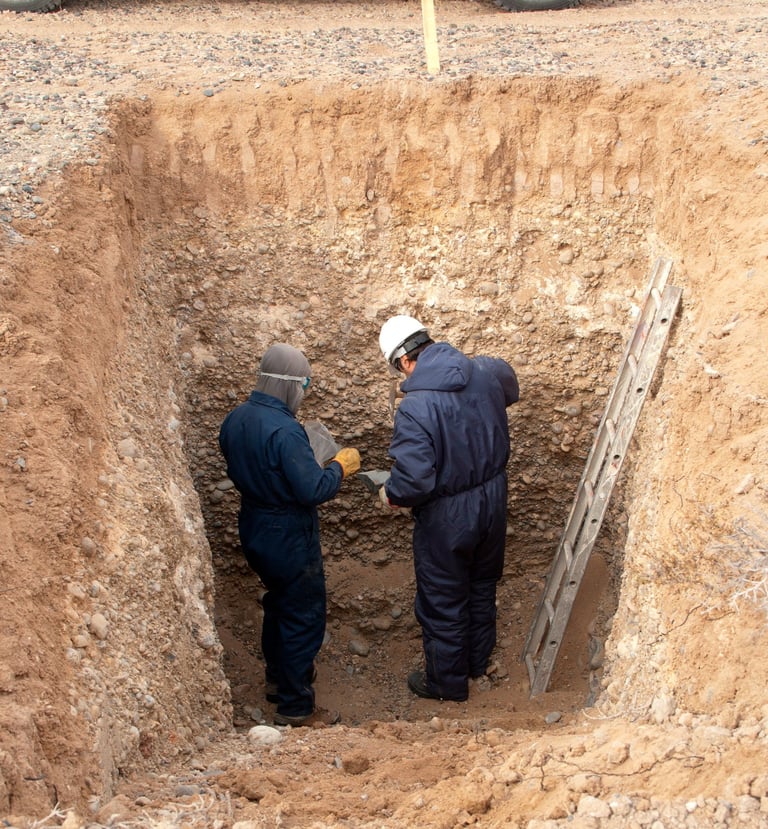 The most relevant task executed during the exploration was the opening of several pits and sampling the sediments in them. The pits (Fig. 5) were located at the nodes of a grid, which started with an opening of 500 x 500 m and then shifted to an opening of 200 x 200 m. Those pits have approximately 2 x 2 m in plan view, and a depth ranging from two to four meters; they were devised for describing and sampling the mineralized layer of sediments, and later try to estimate the amount of uranium contained and extractable from the deposit.