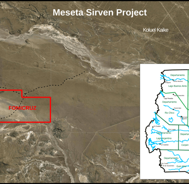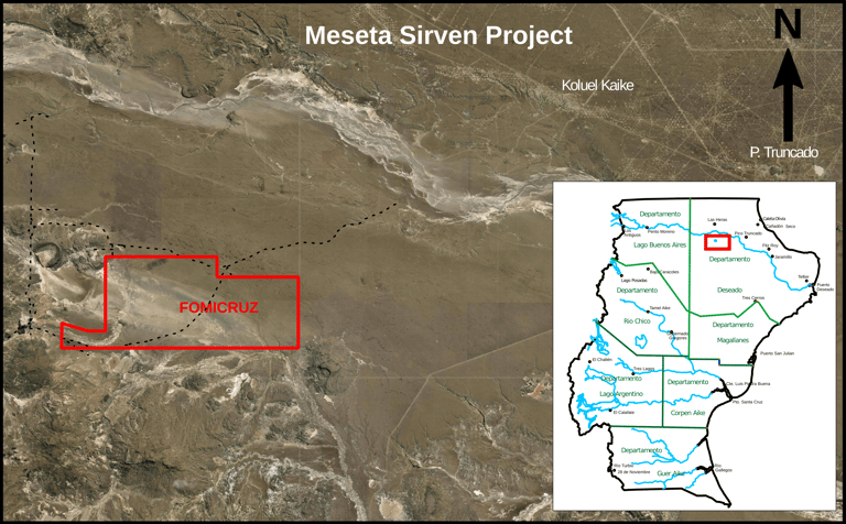 The Meseta Sirven project is located in the north of the Deseado Massif (Fig. 1); it covers an area of 16294 ha, and it is secured by seven mining concessions owned by Fomicruz. Since 2005, Fomicruz has intermittently explored this project for uranium in association with CNEA (the National Atomic Energy Commission of Argentina).